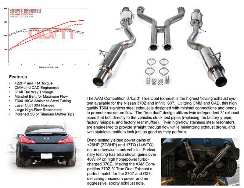 The AAM Competition G37 3” True Dual Exhaust is the highest flowing exhaust system available for the Infiniti G37. The “true dual” design utilizes twin independent 3” exhaust pipes that bolt directly to the vehicles stock test pipes (replacing the factory y-pipe, factory midpipe, and factory rear muffler).